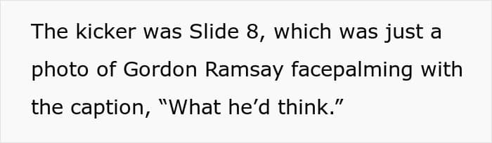 In an interview with We, the OP, Esmeralda, shared that in the past, she has suggested that her boyfriend at least try his hand in cooking; however, in vain. “I had suggested multiple times that he try learning to cook, even for simple things like weekend breakfasts or quick dinners. Each time, he’d laugh it off and claim that the kitchen ‘wasn’t his domain’ or joke about how he’d ‘burn water’ if given the chance. It was one of those ongoing things in our relationship where I hoped he’d eventually step up, but he never took the initiative seriously—until he was crafting slides about my cooking, apparently,” she shared.