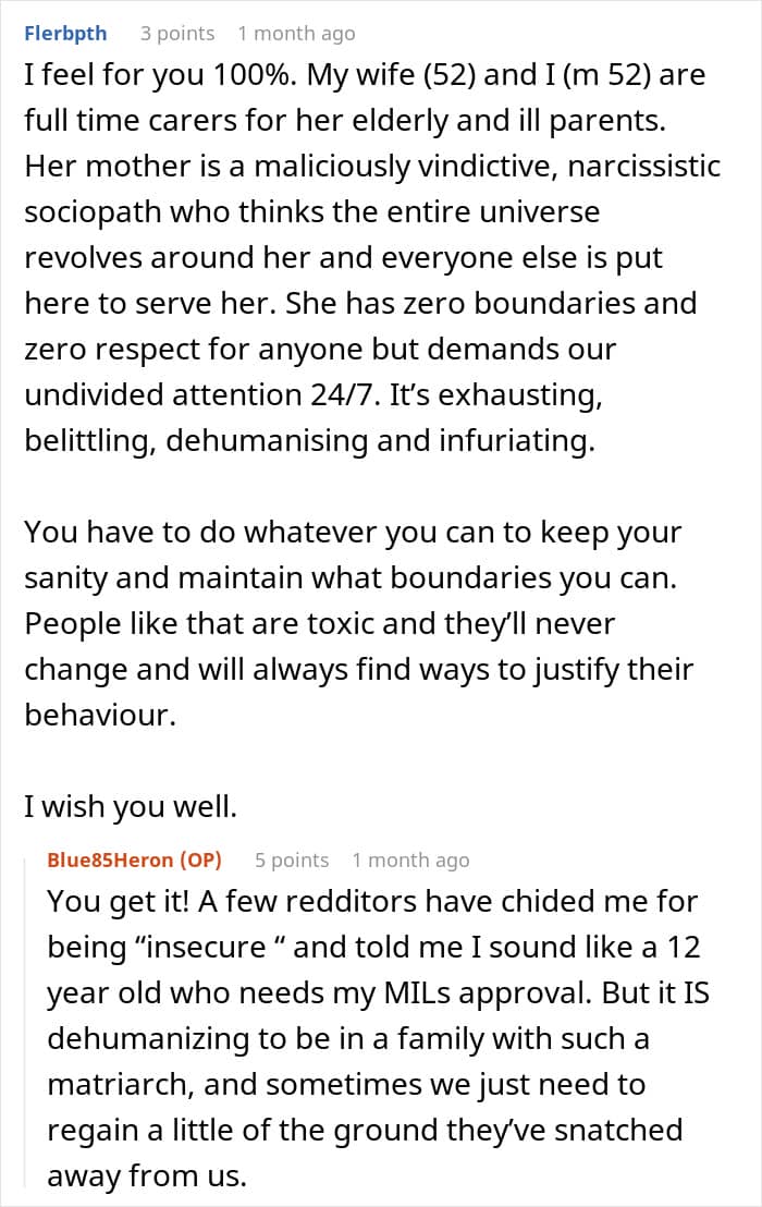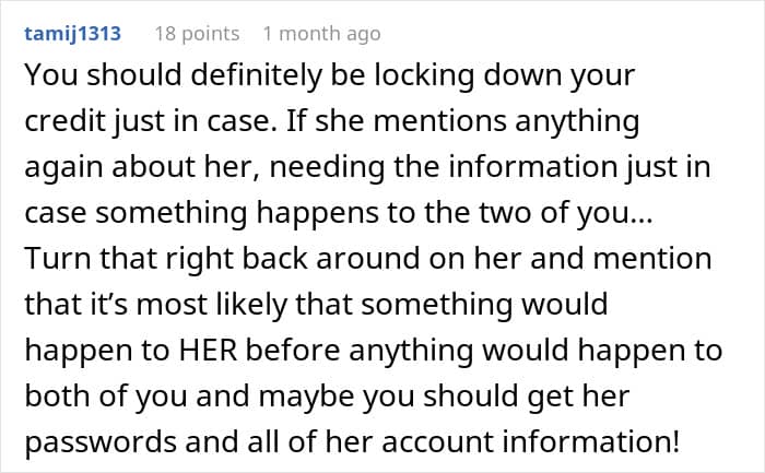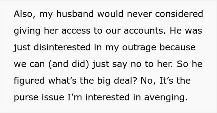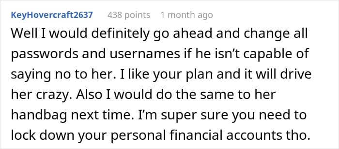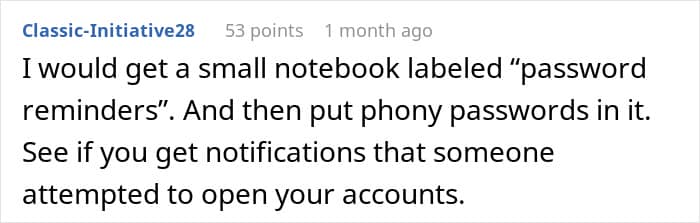 One thing that frequently spurs on terrible in-law behavior is their adult child not taking their actions seriously. Many people hand-wave their parents’ behavior or, even worse, take their side in situations like this. Imagine being this woman with a husband who refused to listen to you or, again, even worse, voluntarily handed over bank and investment account passwords to their mother. Regardless, this woman’s actions are, at “worst” just a bit of a prank, and at best something to make her MIL’s unhealthy snooping an issue for her.