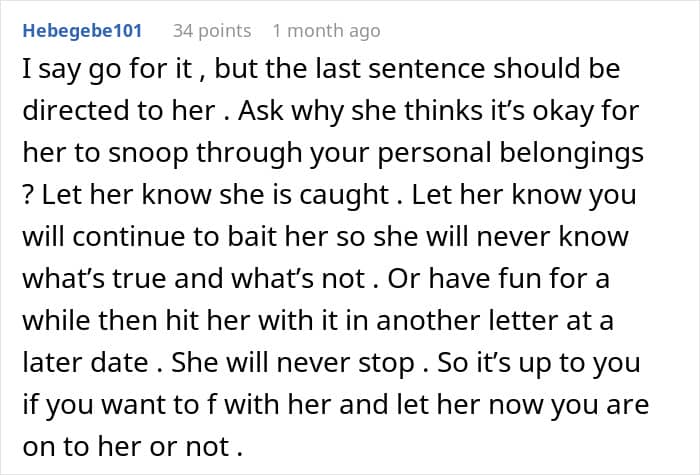 It’s also worth pointing out that the husband is quite aware of how she acts, in the woman’s own words, “we did say no to her.” In this sense, the wife’s plan is ingenious, as it only “harms” the MIL, in the broadest sense of the word, if she is legitimately snooping around. At the very least, it’s just a bit of fun. After all, who doesn’t like making up fake letters for fake scenarios?