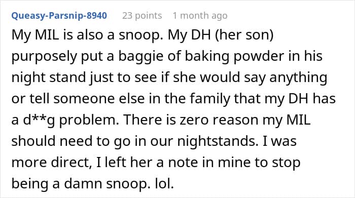 While “bad in-laws” seems like a tale as old as time, it’s important to note that in this story, the MIL is going “above and beyond.” Normally, one complains about passive-aggressive comments or perhaps too many demands about what to have for Thanksgiving dinner, but secretly going through someone’s stuff is entirely abnormal. This is why some folks end up taking drastic measures to limit the damage their spouse’s family insists on inflicting.