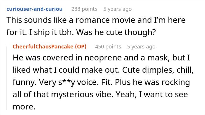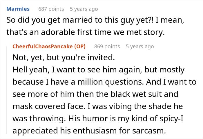 Mortified but also consumed by the absurdity of it all, she invited the “merman” and his clandestine crew for a beer at the bar where she worked. The story of her failed rescue went viral at her job, and after a nail-biting night of waiting, he actually showed up. The two immediately vibed over their shared self-deprecating sense of humor, and what started as a moment of pure cringe blossomed into a real connection.