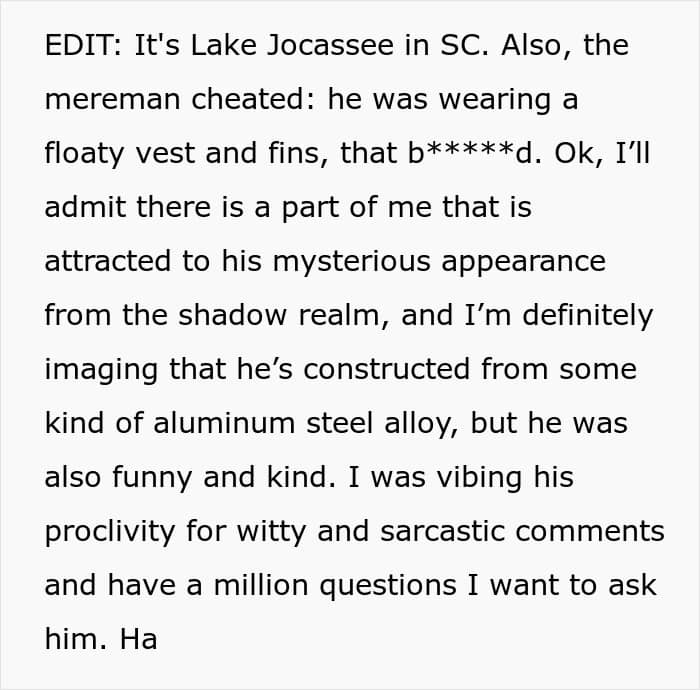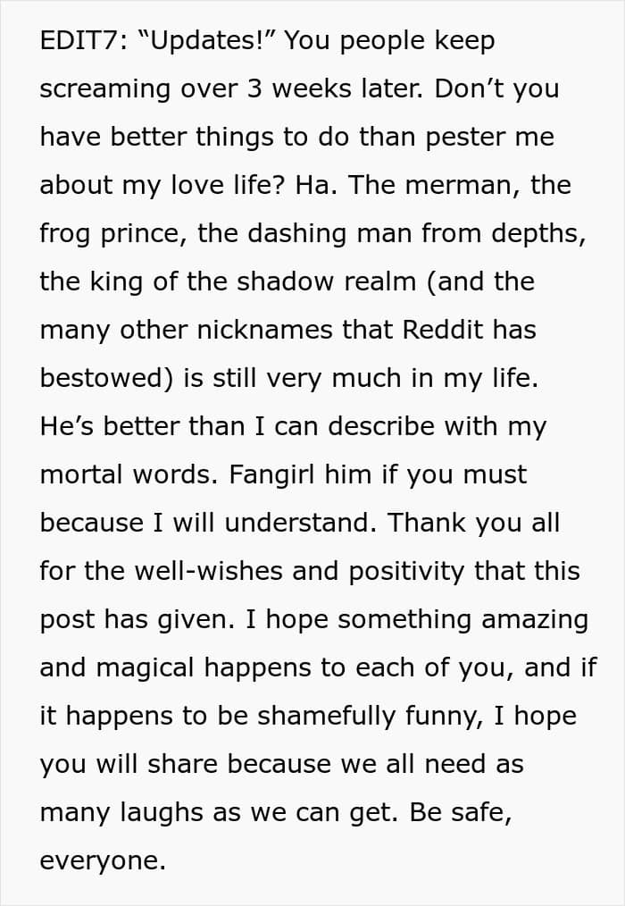 Weeks later, the narrator confirmed that the “merman” was still very much in her life and worthy of a leading-man role. What began as a “today I messed up” post about a spectacularly embarrassing moment turned into a real-life rom-com, a story so good that the internet waits with bated breath for updates.
