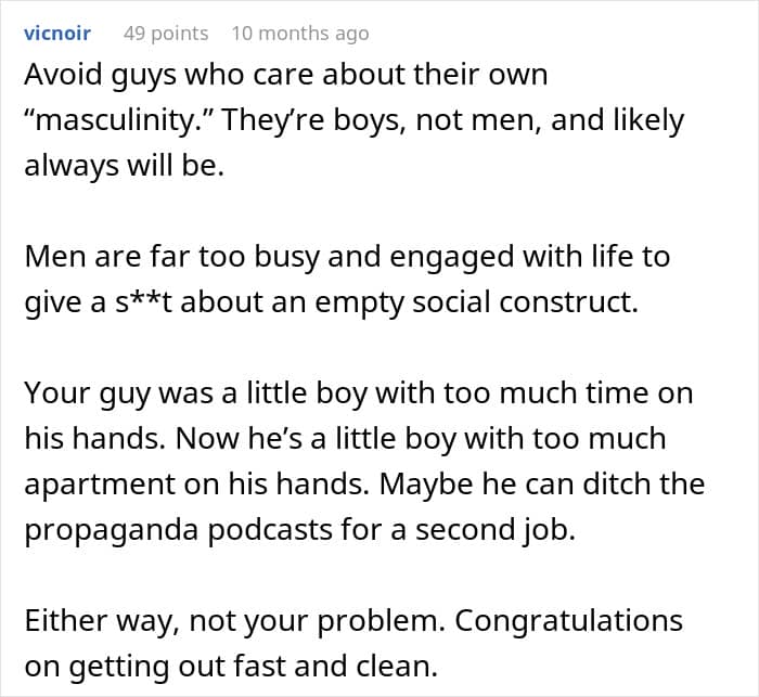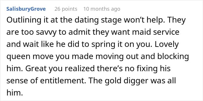 For a while, this couple did well splitting chores 50/50. That is, until the boyfriend got a pay increase. Then he quietly boycotted his share of housework, which the girlfriend didn’t like, so she dumped him in the blink of an eye.