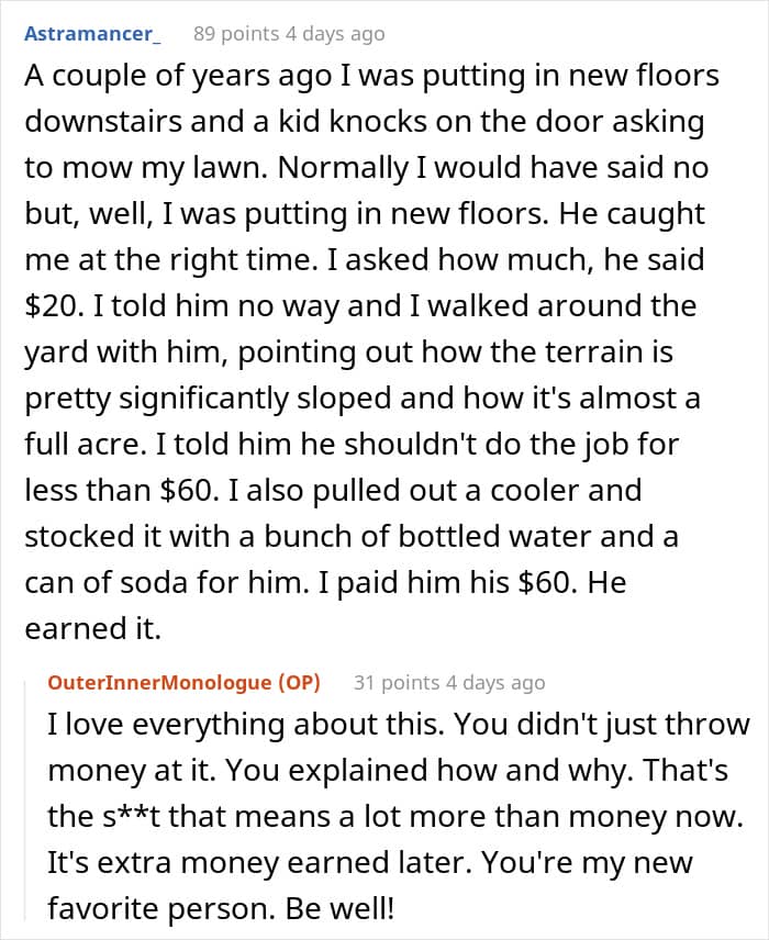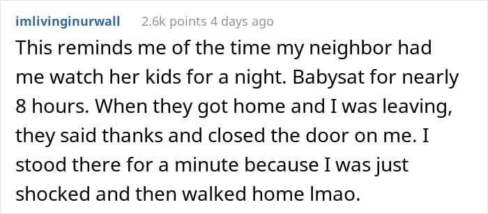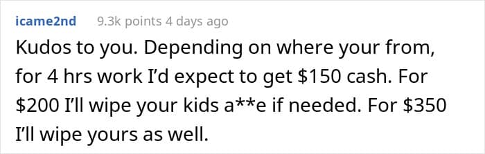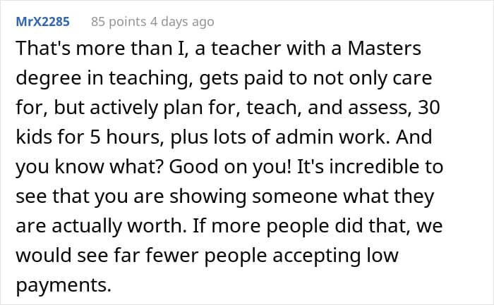 OuterInnerMonologue’s post on the ‘Anti Work’ subreddit drew quite the attention from the community members. At the time of writing, it has amassed more than 23k upvotes with users praising the parents and their decision to imprint the value of good work on a teenager’s mind. Hundreds of people also contributed to the discussion about compensation that babysitters should receive in the comments, with some questioning the amount the teen received and others deeming it to be the exact right amount.