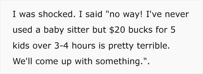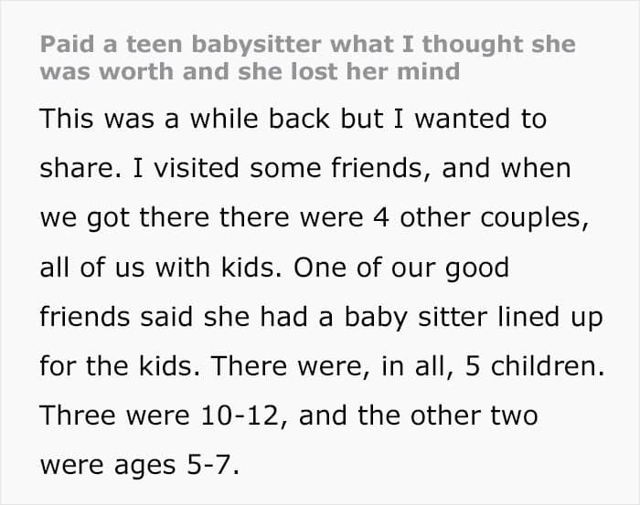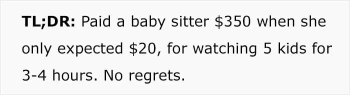 “There were, in all, 5 children,” the user wrote. “That’s a hell of a job for anyone, let alone a teen.” But when it came to discussing her pay with the other couples, the man was shocked to hear they believed her efforts were worth so little. Being a huge proponent of fair pay, he decided to take matters into his own hands. Read on for how the story unfolded, as well as an outpouring of reactions it received, then be sure to weigh in on the situation in the comments!