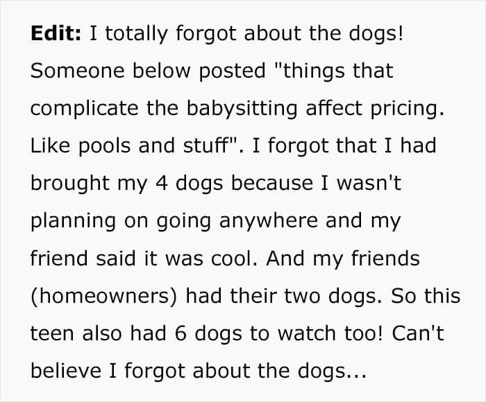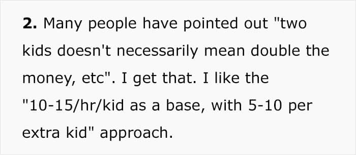 Believing in fair pay and that everyone should be respected for their efforts led the man and his wife to look for a logical way to determine how much the teen babysitter should be paid. “We honestly had no idea,” he told us. “We figured 15/hr as a base because that would be a decent minimum wage. And per kid, well, because we knew all these kids and some definitely warranted 15/hr per kid.”