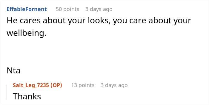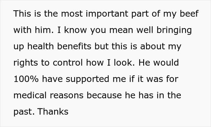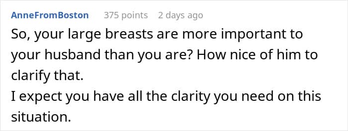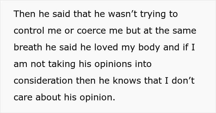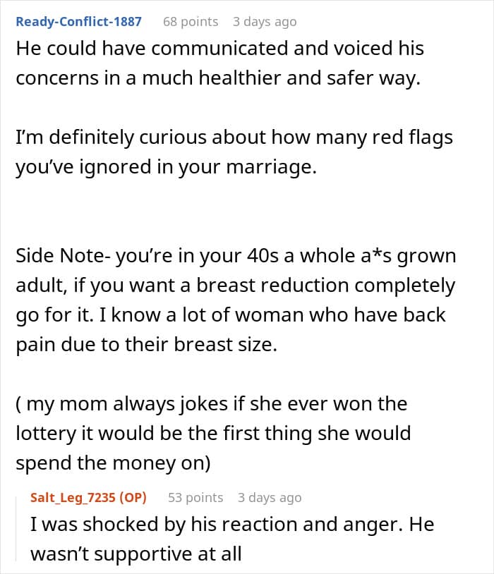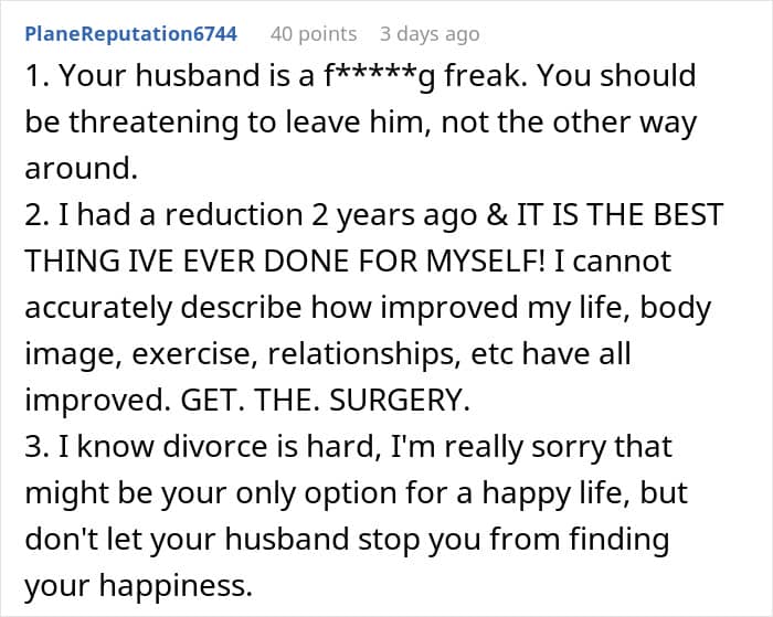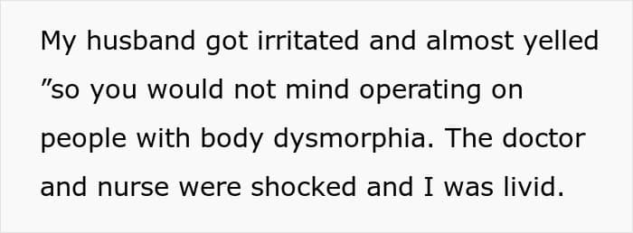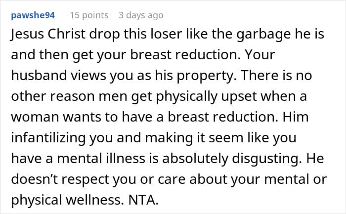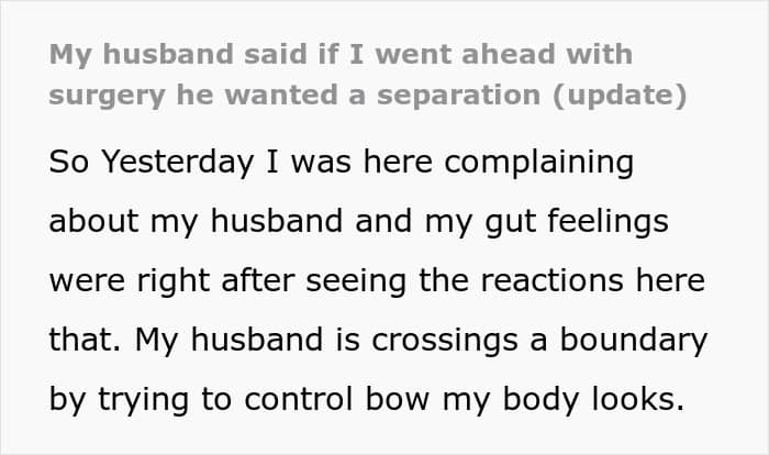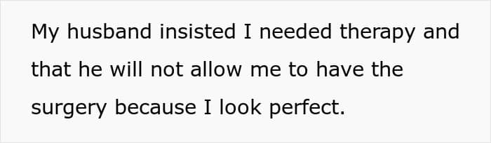 According to the wife, her husband’s reason for not allowing the surgery was that he thought she looked “perfect” already. However, their conversation eventually shifted to him threatening to leave her if she went through with the procedure.