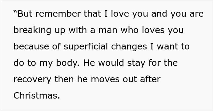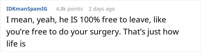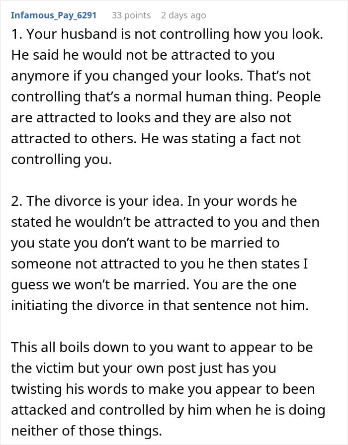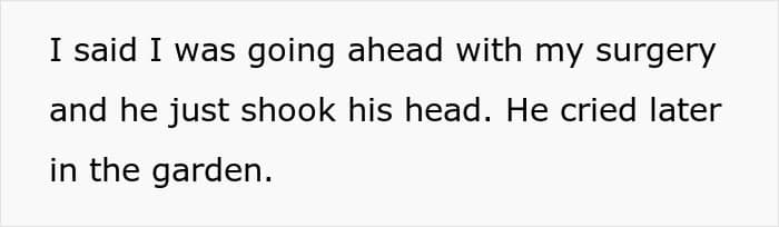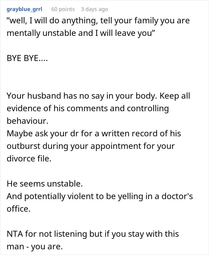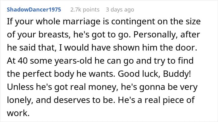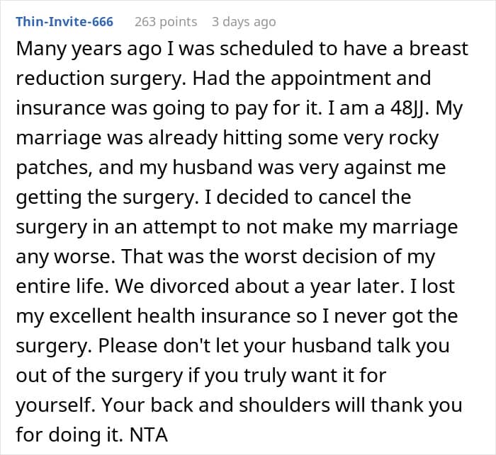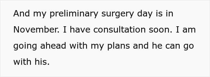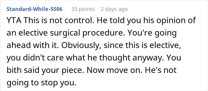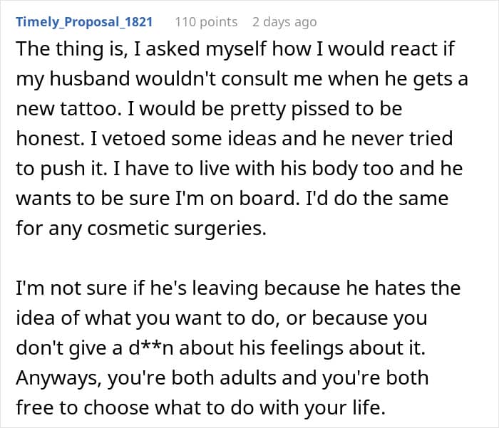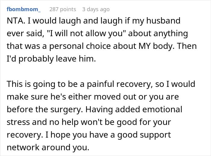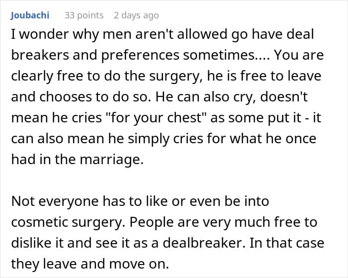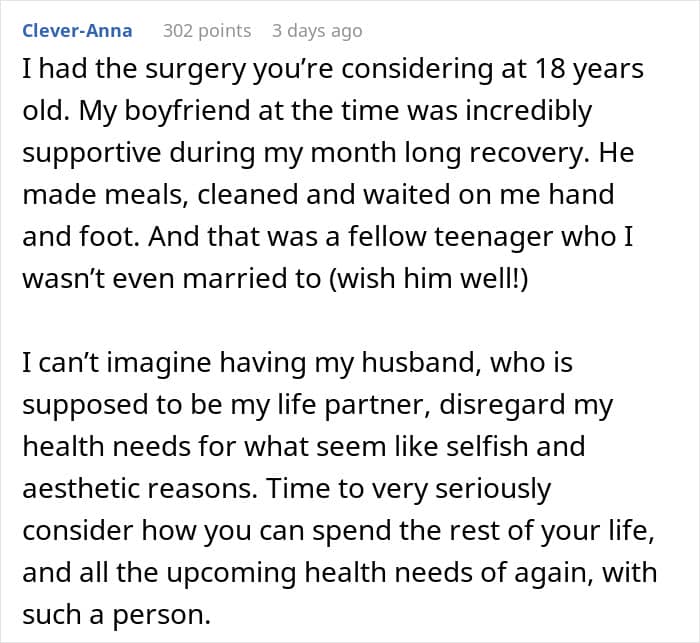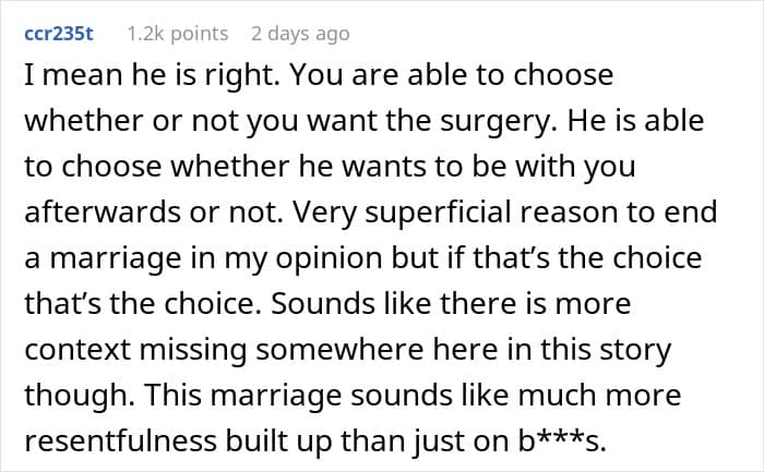 While it may seem like the woman chose her surgery over keeping the marriage, having a spouse who coerces you into doing what he wants isn’t healthy either. Their marriage may have been doomed the moment he threatened divorce, and it could be for the best.