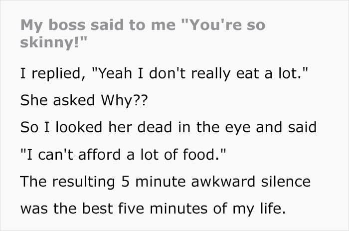 Had a boss say “damn slim you need to pack on some pounds if you’re gonna work for me” I looked that f*cker dead in the eye and replied “give me a raise and I’ll eat more ya fat f*ck” I was fired the next week.