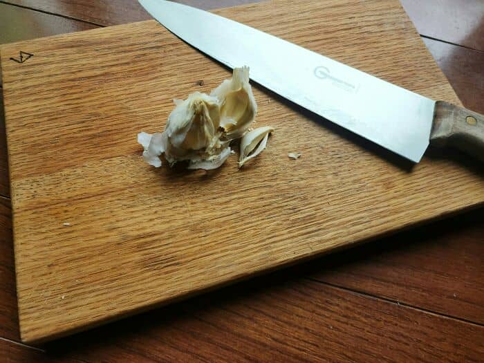 Crushing garlic with the flat of a knife blade rather than peeling them by hand.