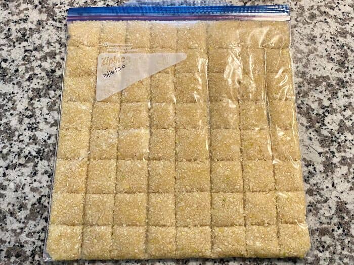 Similar thing with breakfast sausage except I purchase it in the one-pound log now (instead of patties or links back in the day). Pat the sausage out to about 1/2″ thick onto a baking tray and bake in the oven. When done, cut it into 8 pieces and freeze.