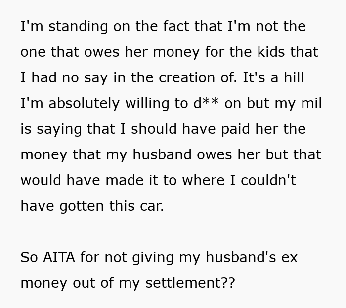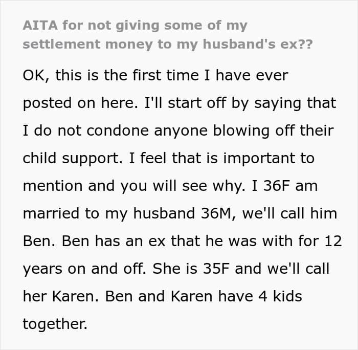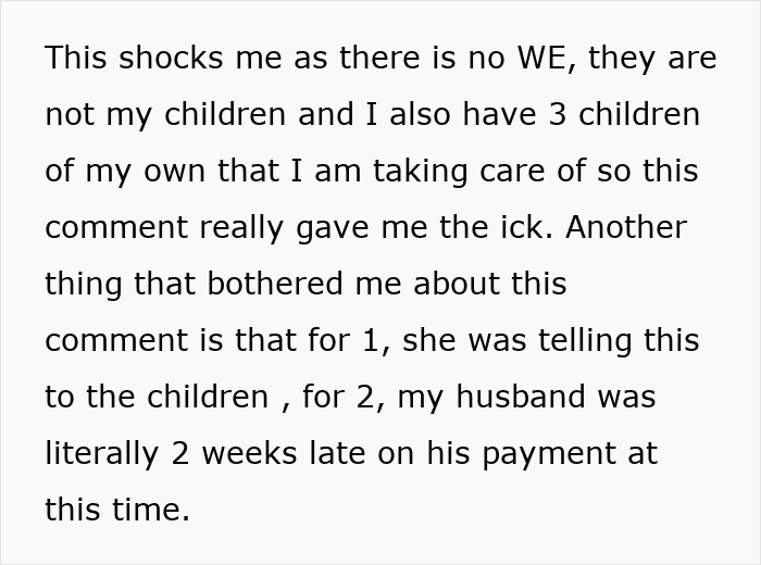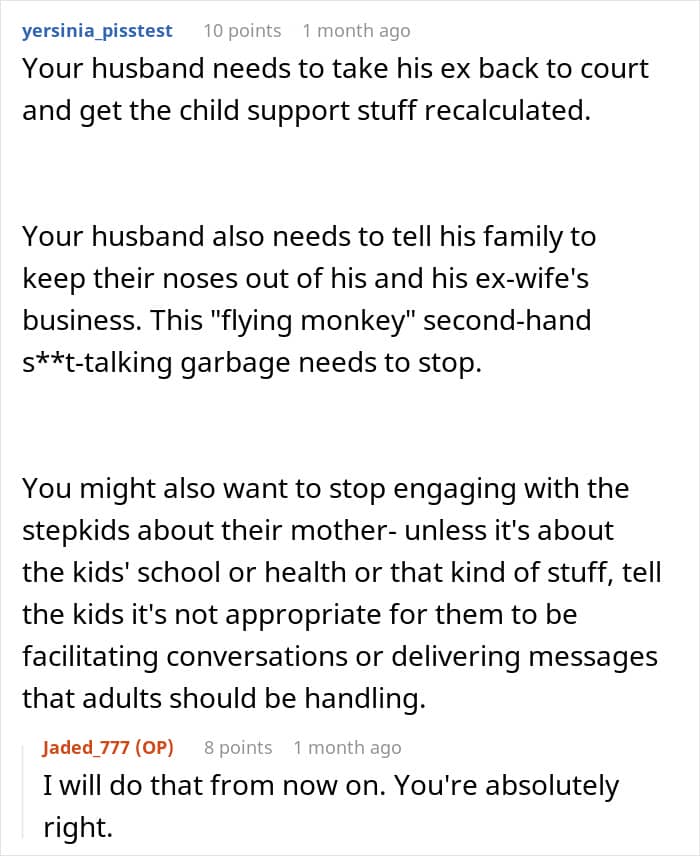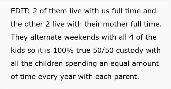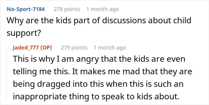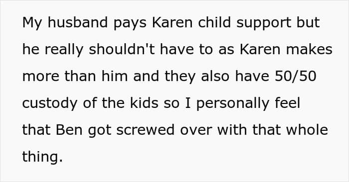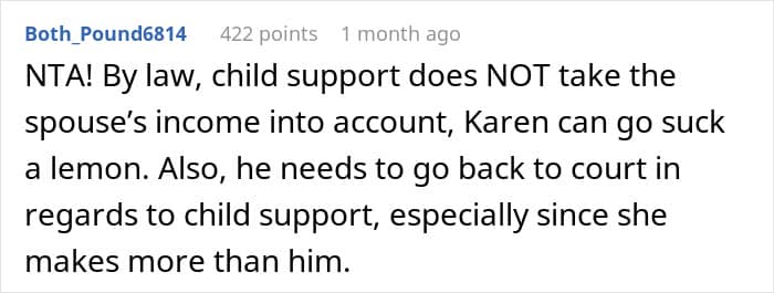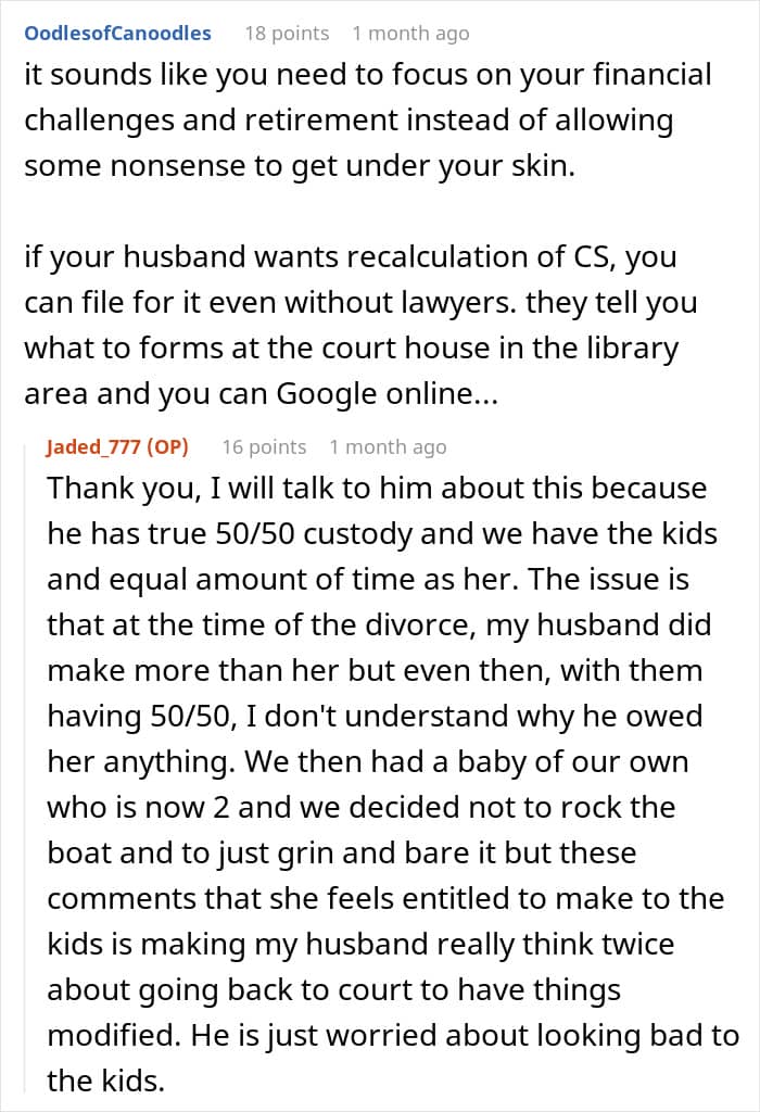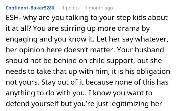 Quite a few things are causing tension in this family’s child support arrangement, which readers were quick to point out in the comments. One that is taking the front stage is the new partner that the ex-wife expects to pay child support instead of her husband. As most, and even the author herself, rightly mentioned, new partners aren’t responsible for financially contributing to their stepkids’ child support.