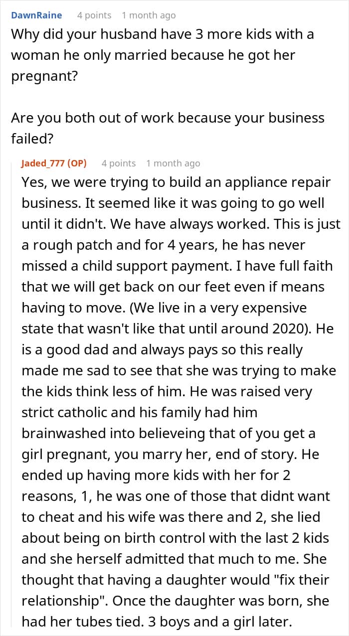 Since the dad now earns less with the family’s business failing, it might seem that he should negotiate for smaller child support payments. However, the original poster, his current wife, clarified this, saying that their lawyers believe this factor doesn’t change anything, since in their state things operate differently.