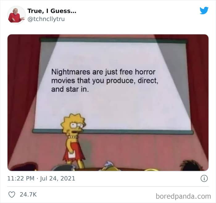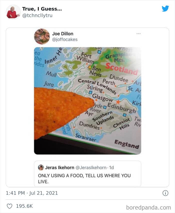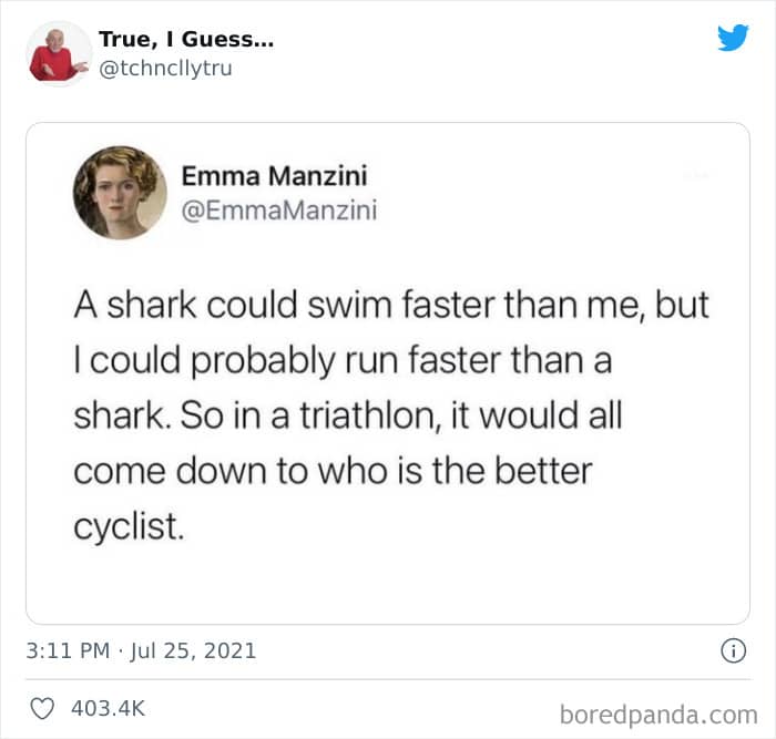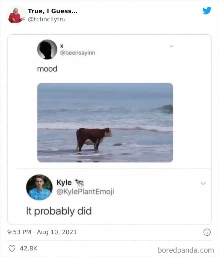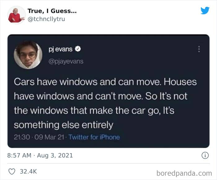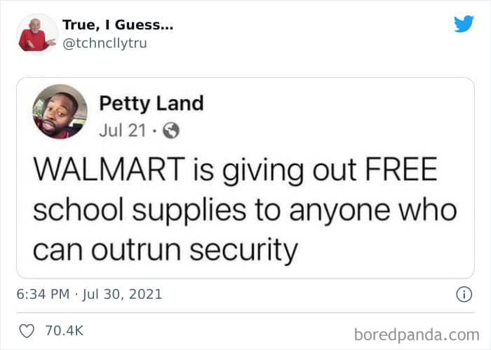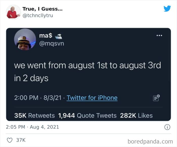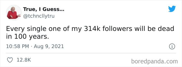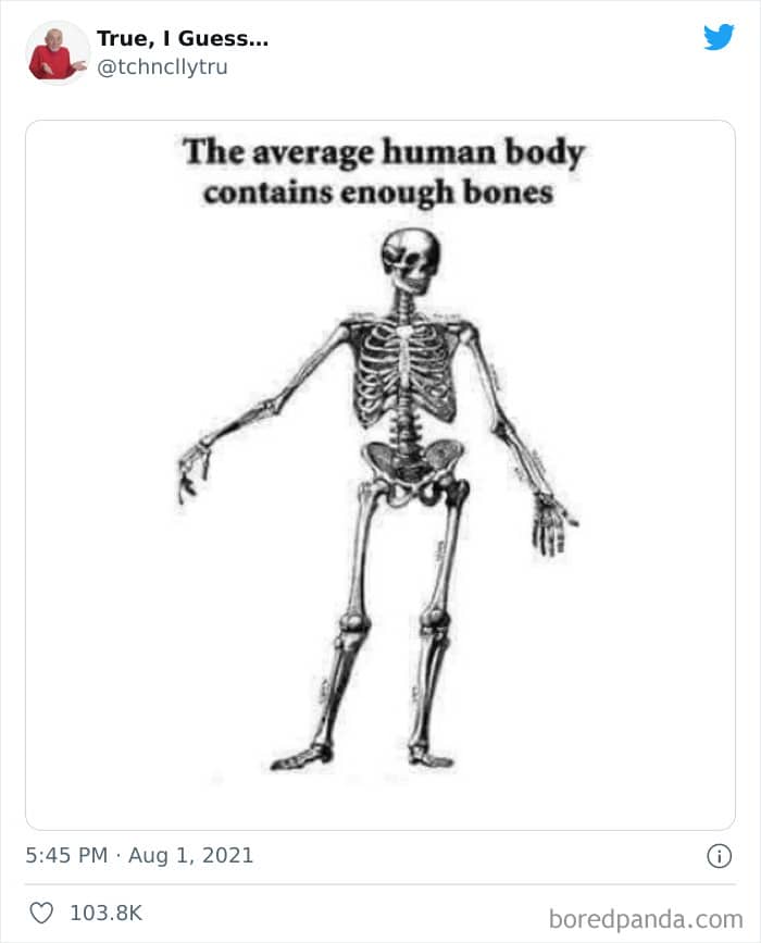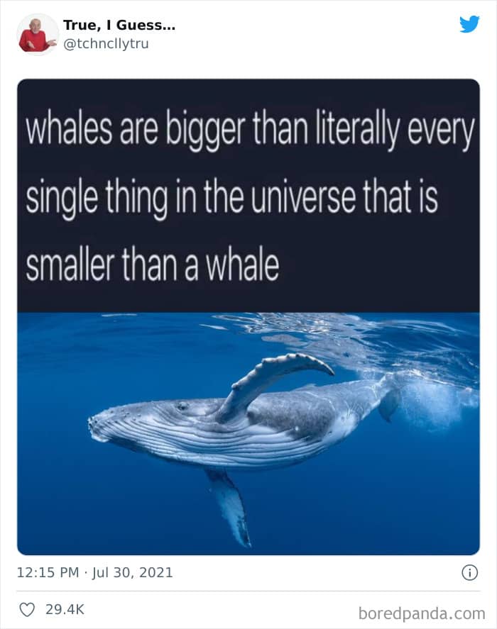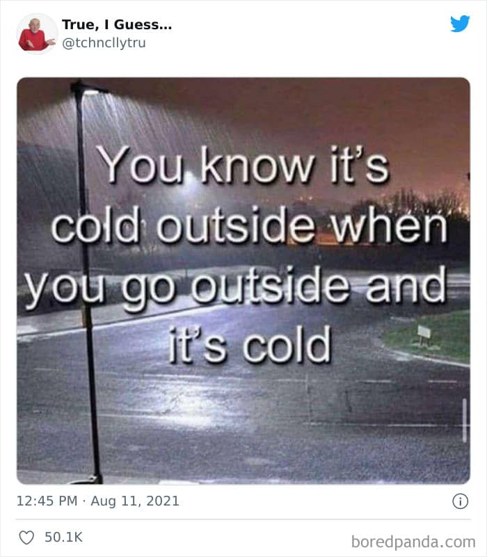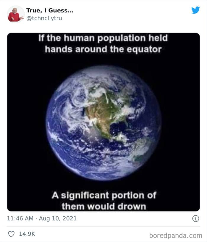 It’s called “True, I Guess…” and it shares — you guessed it — pictures of things that are technically true. It sounds simple, but believe me, just a couple of its tweets can make you question both your existence and the world around you.
