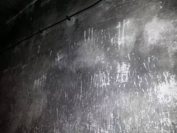 Photo of scratch marks on the walls of an Auschwitz gas chamber.