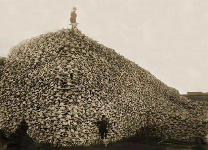 In 1870, the American bison was hunted wildly by European colonists and nearly extinct. On a flat area, uncountable American bison skulls were piled up.