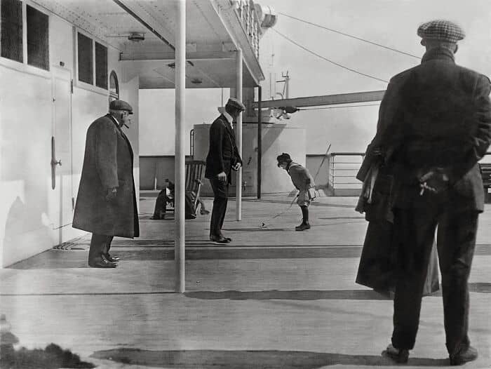 A photograph taken by Roman Catholic Priest Frances Browne shows Douglas Spedden playing the topper on the deck of the “Unsinkable Ship”.