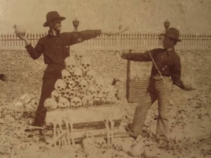 This picture shows an overcrowded graveyard and the skeletons dug up from their graves and became a popular photo-op for tourists, here in the picture, American Soldiers.