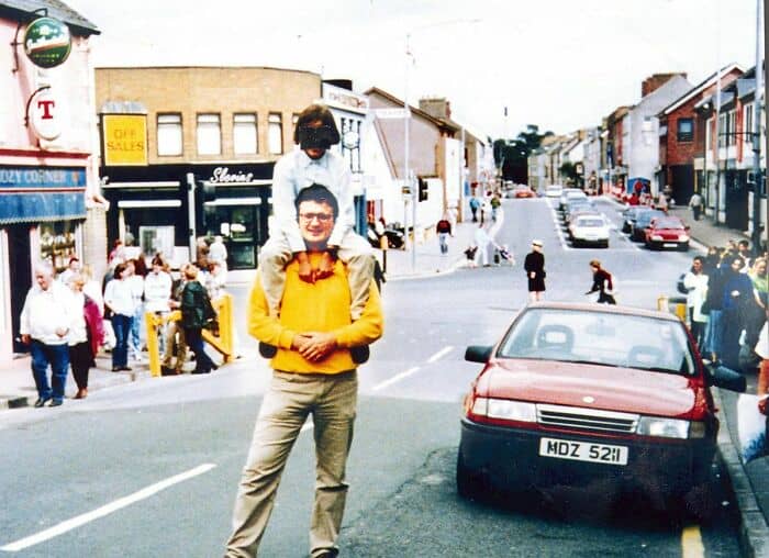 Before the Omagh bombing in Northern Ireland. Almost immediately after this photo was taken, a bomb was set off in the red car beside the boy on his dad’s shoulders. The father and child survived miraculously, but the photographer and 28 others died, while around 220 were injured.