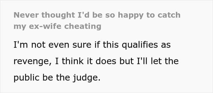 The poster managed to get photos of his wife cheating, but when he showed them to her, she pretended her affair only started after their divorce proceedings had begun. Luckily for the OP, his wife’s boyfriend contacted him and decided to come clean about their relationship, which had actually been going on for 6 months.