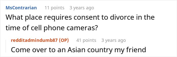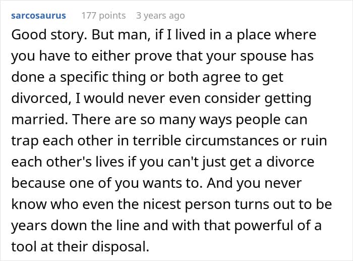 A year into his relationship, the poster realized that he shouldn’t have married his wife, so he decided to get a divorce. The only problem was that in his country, both partners had to be on the same page for the marriage to be dissolved, or be able to prove that one person was at fault for the relationship ending.