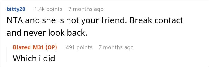 She claimed she was thrown out of the house and needed his help, but he had had enough of her drama. He suspected that she had been lying to him all along, and also found out that this was her ‘loyalty test’, which apparently, he had failed. The woman also had the audacity to badmouth him to others; that’s when he just cut her off for good and decided to never contact her again.