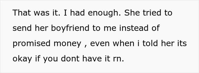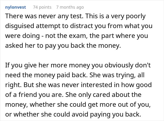However, nobody said anything since she was so happy. Meanwhile, it was time to return OP’s money, but she kept giving excuses, and when she finally decided a day to return it, her boyfriend contacted him instead of her. The poster was giving his exam, but he also constantly got calls from her, which he obviously couldn’t answer.