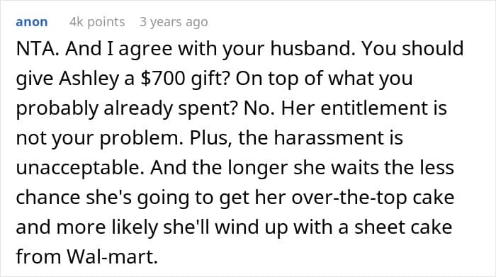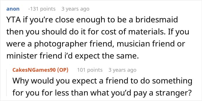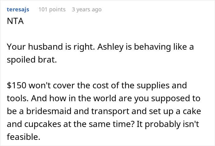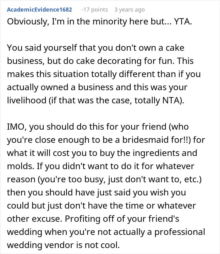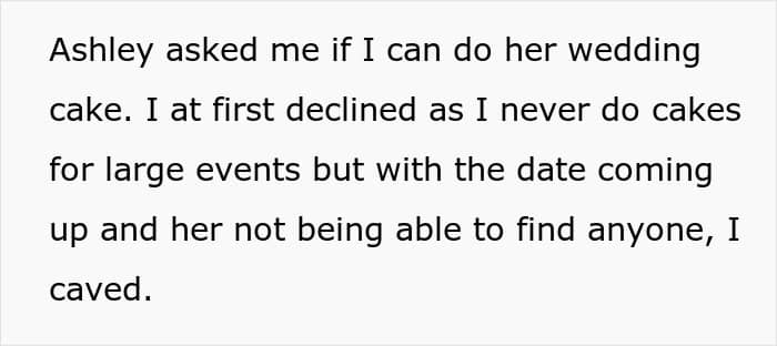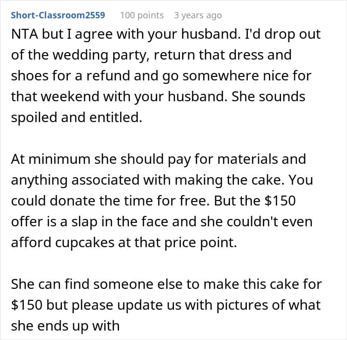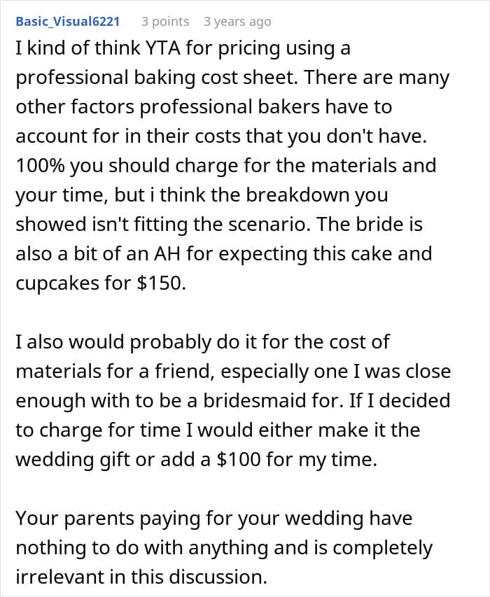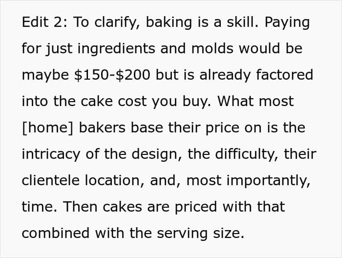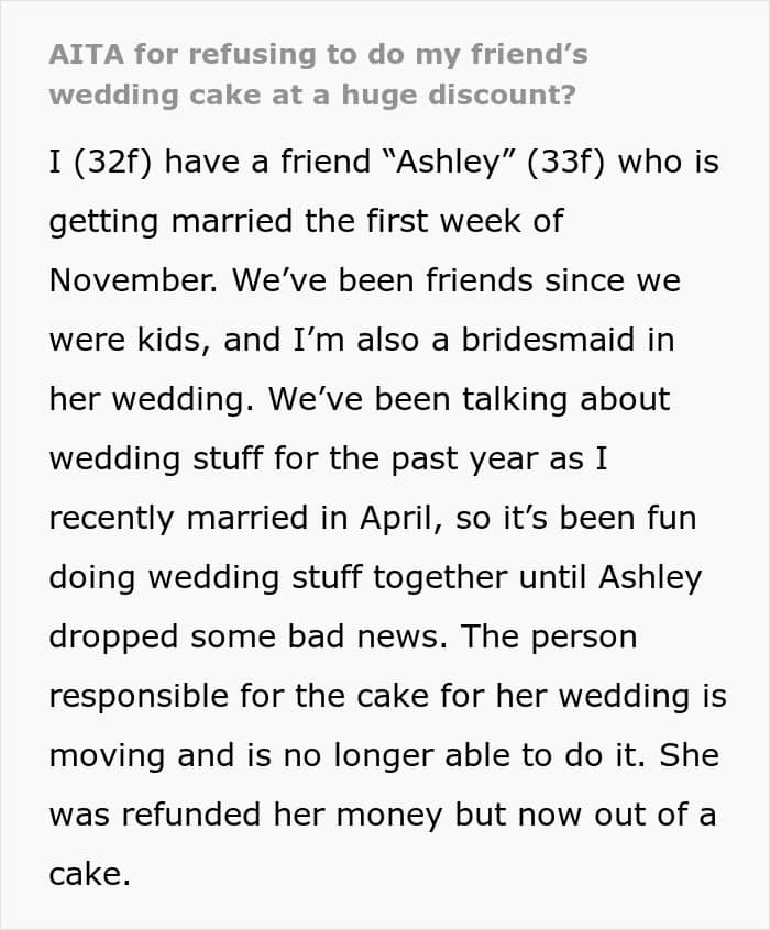 A bride didn’t seem to understand this concept when she asked her childhood friend and bridesmaid to bake her wedding cake. With the total amount costing around $800, she wanted to pay a meager $150.