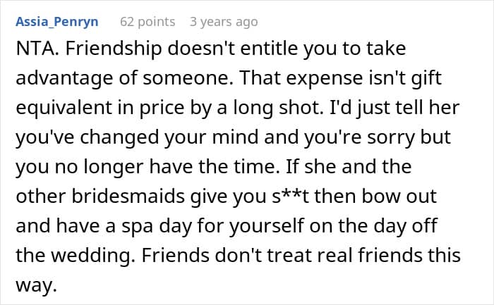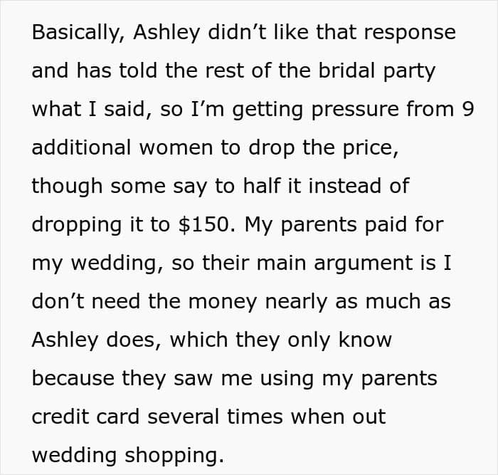 The bride may have been feeling the pressure as her wedding day approaches, along with the financial burden of her bills racking up. However, it does not excuse her to make such a ridiculous request in the name of friendship.