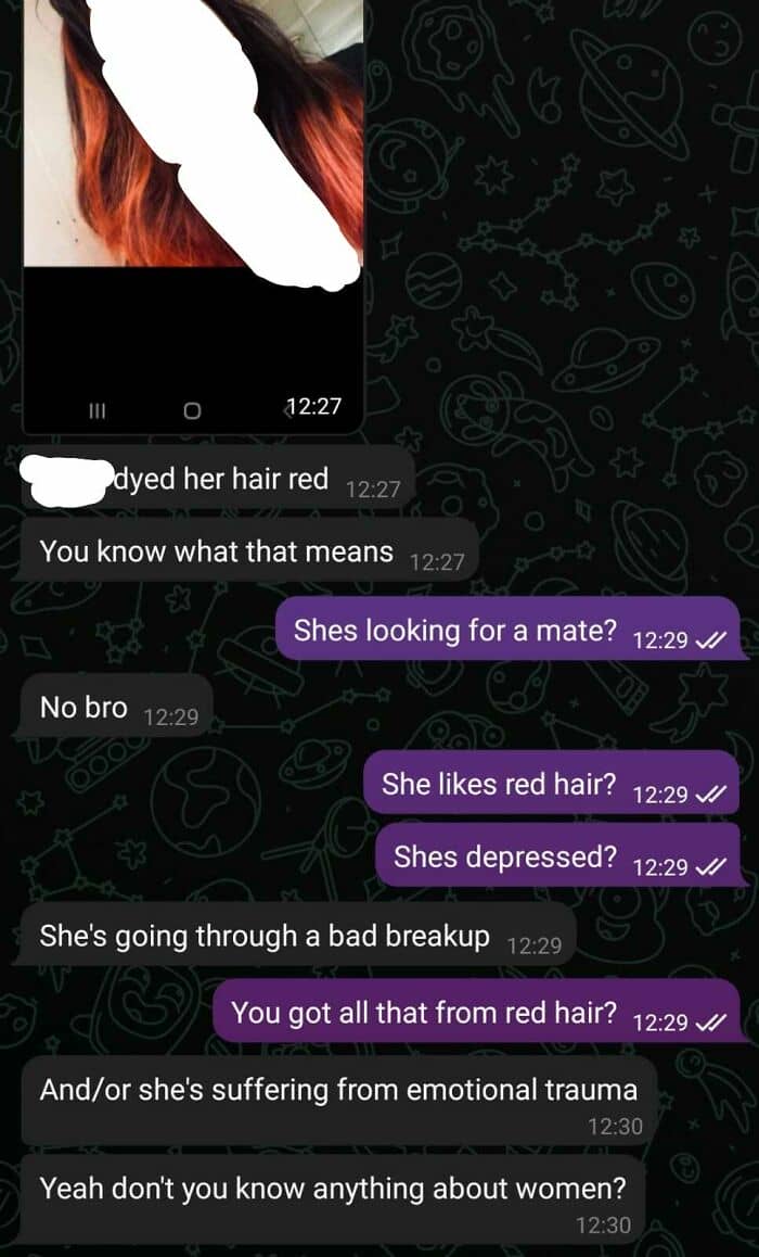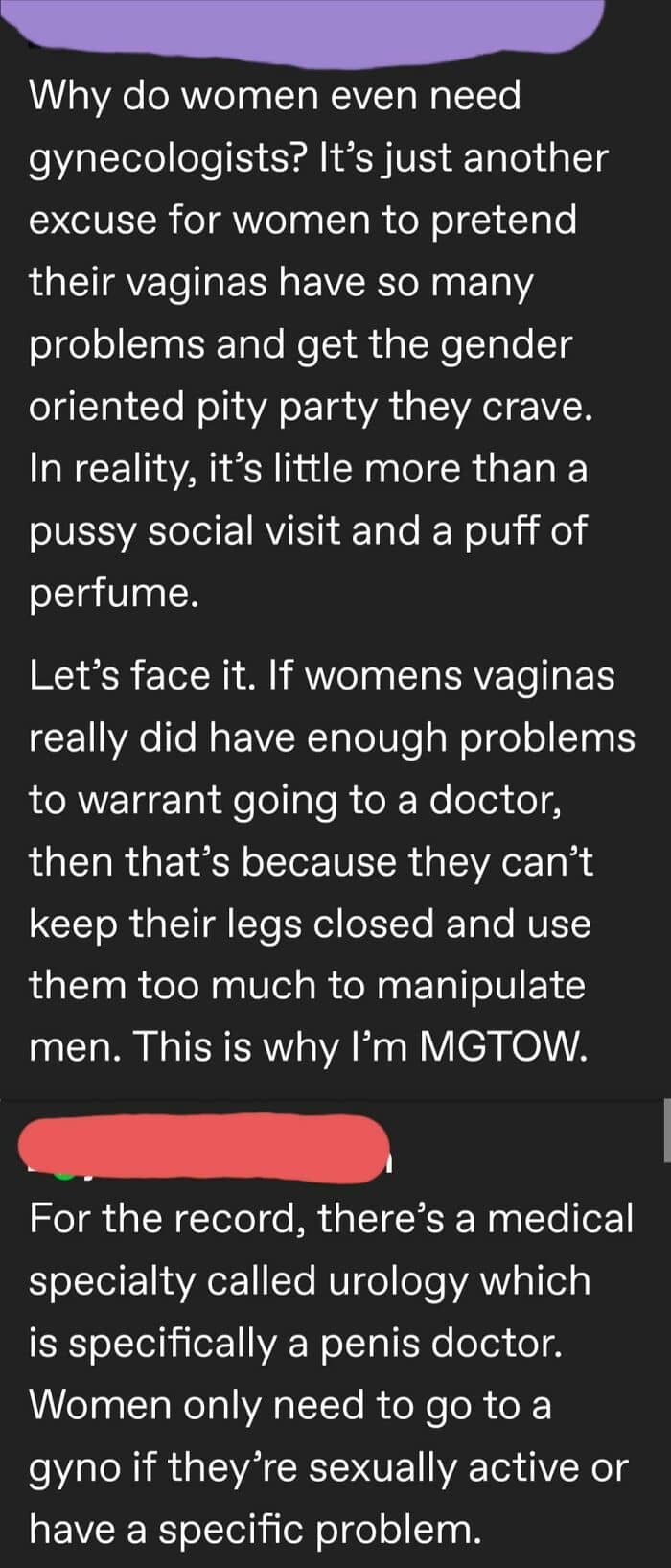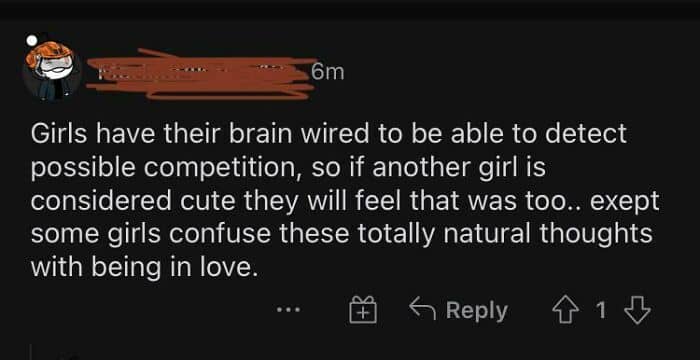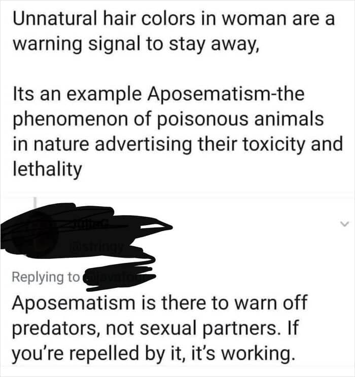 Like, women’s unnatural hair colors are warning signals to stay away, or that periods are telling you to hurry up and get pregnant. And while I’d like to know what kind of bad science fiction books they’re reading, this subreddit r/NotHowGirlsWork gives them a proper treatment in what they deserve: being put in their place and told to cut their BS statements!