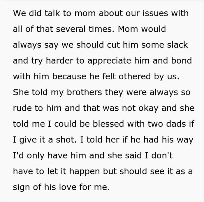 The author of our story today, the user u/Elzouisi8, has faced the same contradictory situation for almost her entire life. On the one hand, her stepfather genuinely wanted to build a good relationship with her and her siblings. On the other hand, he clearly overdid it.