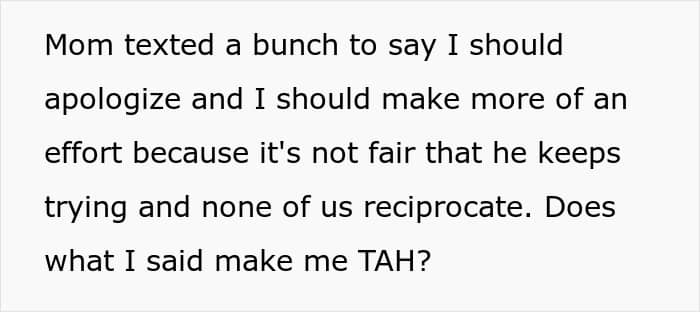 The original poster reasonably countered that their mom had chosen him, not them. The guy burst into tears and then demanded an apology, but the author simply stormed out of the house. Then, after some considerations, she decided to seek support and advice online.
