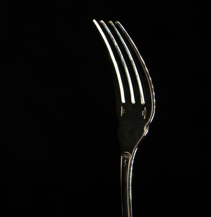 Holding a fork like a kid with a fat crayon while cutting food with the other hand. Hard to describe, but basically with a fist.