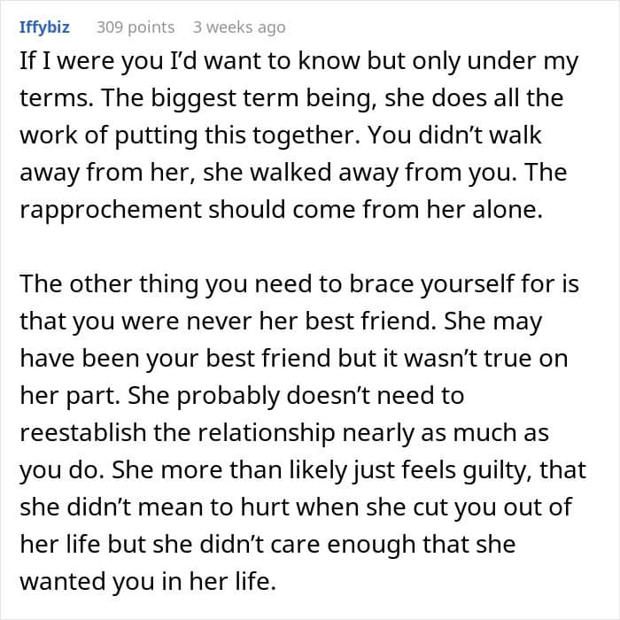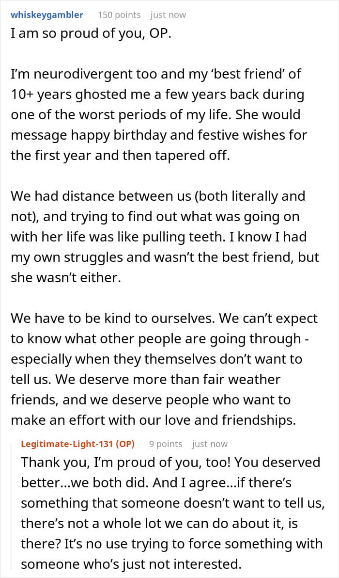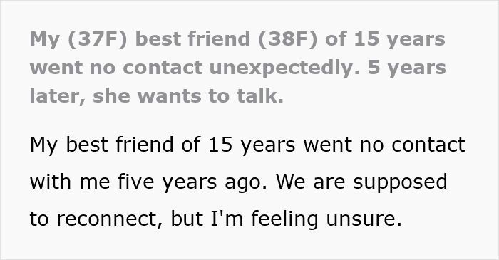 Internet user u/Legitimate-Light-131 turned to the Relationship Advice online community for help with a particularly sensitive situation. She shared how her best friend suddenly went no-contact with her. Then, 5 years later, she wanted to reconnect. Scroll down for the full story, including an important update from the author herself.