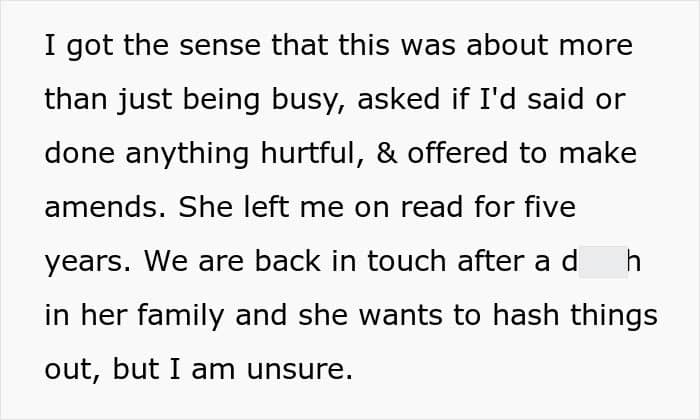 One woman shared how her BFF suddenly went no-contact with her, only to try to reconnect after half a decade of ghosting her