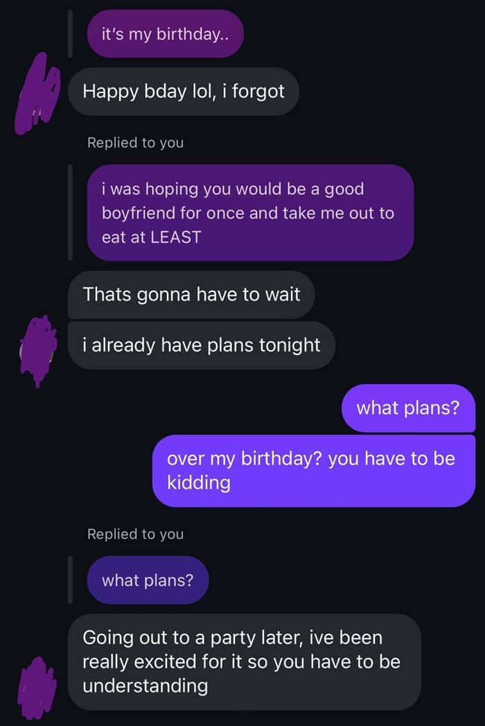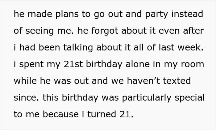 She let it slide, assuming it was a one-off and trusting things would be better next time. Unfortunately, this year proved her hope wrong. She was turning twenty-one, and she sent him a reminder earlier in the day about birthday plans only to discover he had already made plans to party with friends.