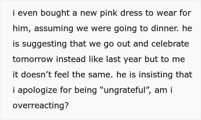 Instead of acknowledging the hurt he caused, her boyfriend doubled down, telling her she was “ungrateful” and insisting she apologize. He suggested celebrating the next day, just like they’d done the year before, but she wasn’t having it.