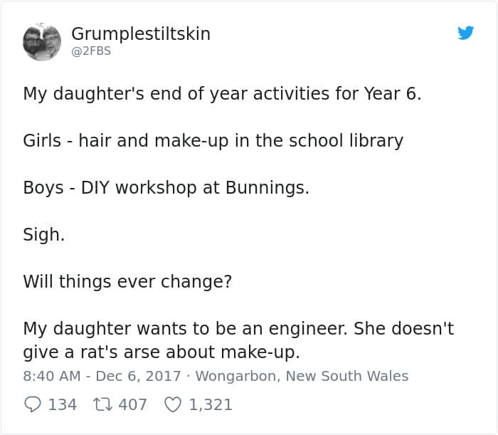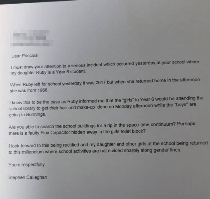 According to Dubbo West Public School’s latest newsletter, ahead of the its self-proclaimed Boy’s And Girl’s Day, girls will be “treated to fabulous hair and light make-up,” while boys will be “going to Bunnings [hardware store], activities and a BBQ lunch.” Though a Department of Education spokesperson has stated that any student can choose either activity, Ruby’s father told us that she “specifically asked her teacher if she could go to Bunnings instead and was told it was only for the boys.” Could the space-time continuum have been breached, or are kids still being subjected to such forms of casual sexism in 2017?