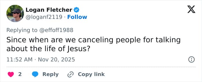 “Since when are we canceling people for talking about the life of Jesus?” another asked.