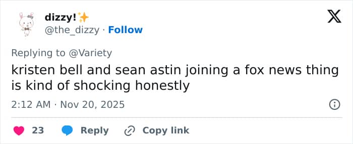 “Kristen Bell working for Fox News?” a fan asked on X. “Well, I guess everyone whose work I have loved since childhood, just wants to self-cancel this year, huh.”