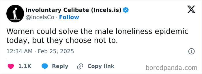 The aforementioned source cited one member of the incel community, saying, “A society where men are not allowed to control their inferior counterpart – a woman – is an awful world.”
