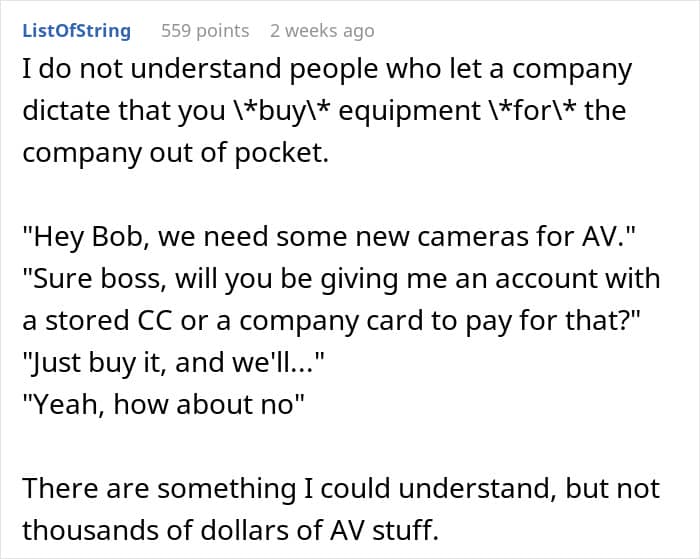 Your company will usually provide the tools you need, but this woman’s boss expected her to spend thousands on expensive equipment