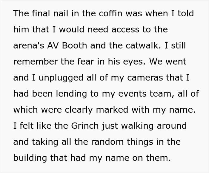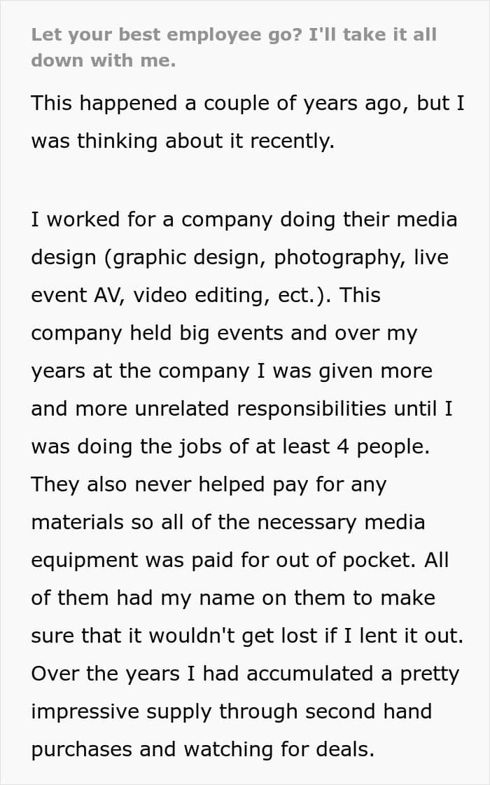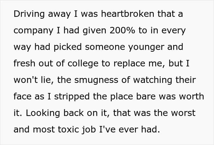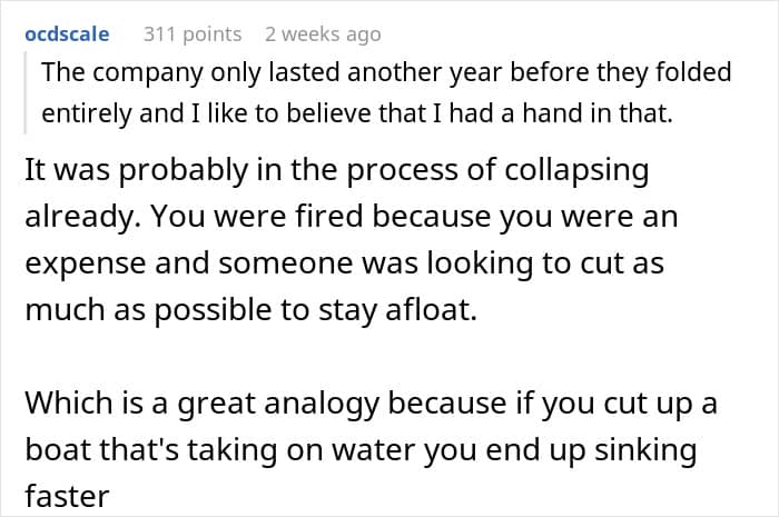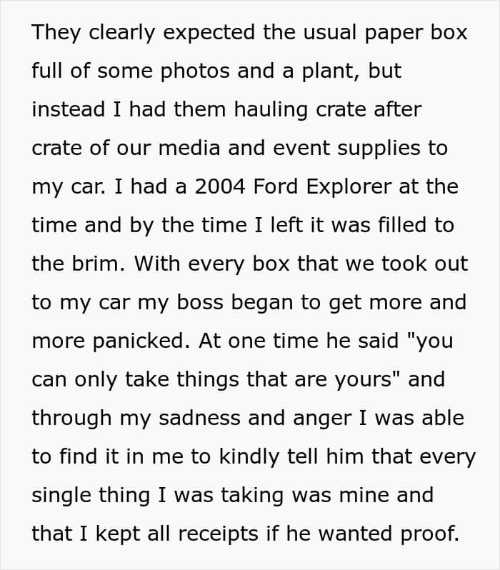 The woman told We she posted her experience on the internet because she felt people would appreciate her “little act of malicious compliance.” But also because she “learned a lot of valuable lessons” from the incident. She was let go many years ago, but the former employee told us she was reminded of the experience while going through a “closet full of equipment the other day.”