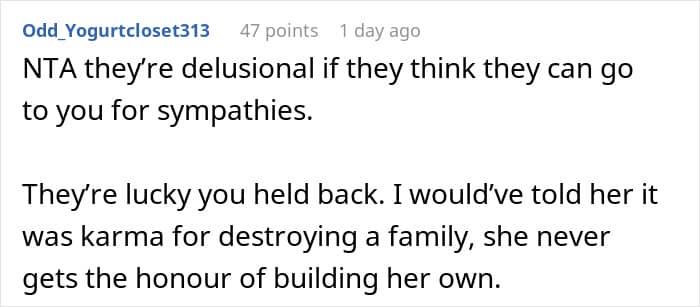 This couple wasn’t so lucky. After the husband cheated and destroyed his family for his co-worker, he wanted to start having kids with his affair partner. Unfortunately, it turned out she couldn’t have children. Heartbroken, the couple turned to the ex-wife for sympathy, but she refused to show compassion to the people who ruined her and possibly her children’s lives.
