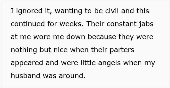 Weeks of jabs built up until one morning, after another backhanded comment, OP finally snapped. With the kids safely inside, she told the ringleader exactly what she thought: that she’d been working nonstop to support her family, and maybe they should examine their own hollow happiness instead of tearing down a stranger.