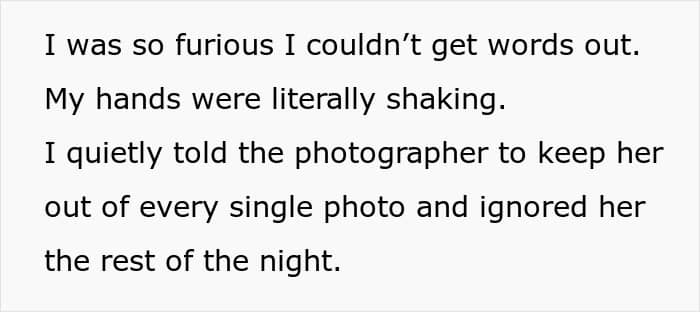 By quietly cutting her from the photos and giving her the silent treatment, the bride is doing exactly that. She’s not “overreacting,” she’s simply refusing to give the heckler a microphone. This bride kept is calm and classy till the very end!
