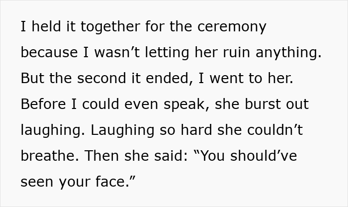 When confronted, she burst out laughing, telling the bride, “You should’ve seen your face”