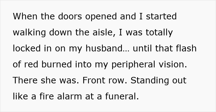 But instead of a makeup emergency, it became a costume change. Five minutes before the ceremony, Olga reappeared in a bright, tight, red dress, lying to the choreographer, claiming the bride had approved it. The bride, walking down the aisle, caught the flash of red in her peripheral vision but managed to hold it together, refusing to let the stunt ruin her vows.
