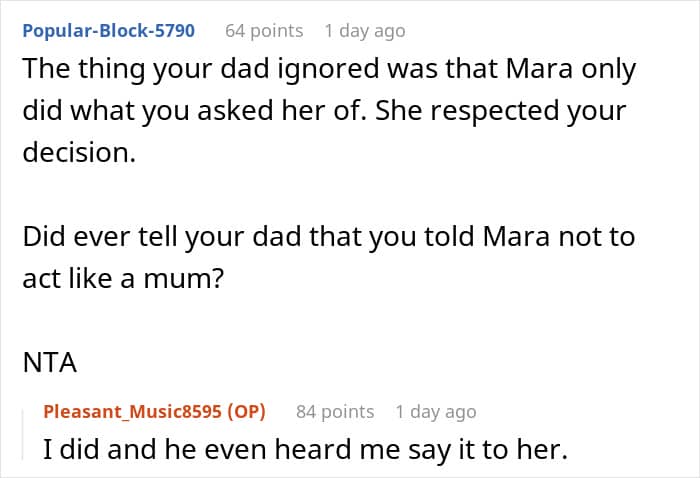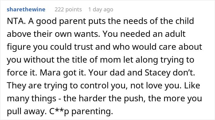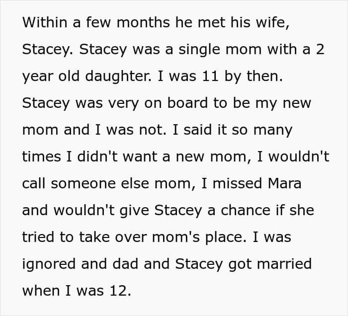 By the time he was 12, OP’s dad had married Stacey, who was very keen on the idea of assuming the role of his new mom, something OP had no interest in, and, once again, repeated to his dad. Fast forward to OP’s 16th birthday, and his dad suddenly seemed to realize he had been very serious about not wanting a second mother.
