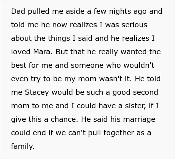 Three years later, and much to OP’s surprise, his dad broke up with Mara and told him she wasn’t putting in enough effort when it came to being a mom. He told his dad he didn’t want a new mom and wouldn’t call someone else mom, either. OP goes on to say that, within a few months, his dad met Stacey, a single mom with a two-year-old daughter.